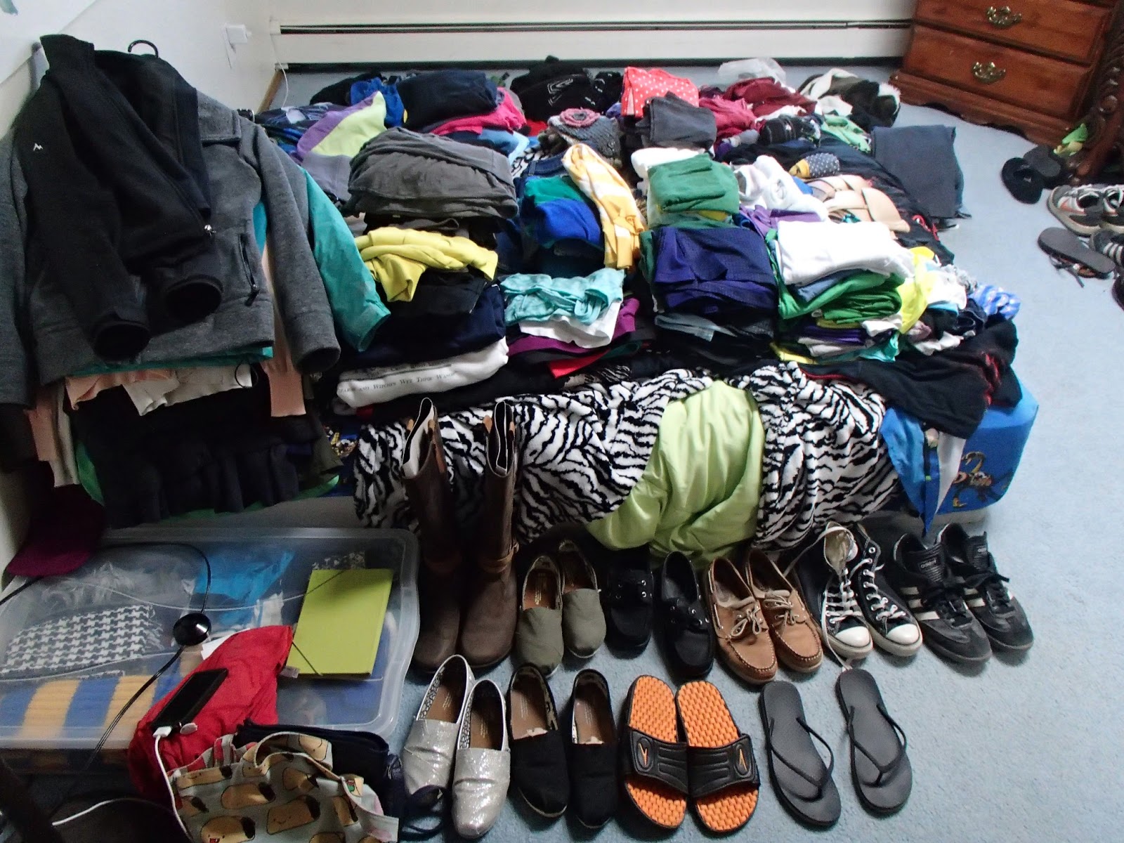 1. Try on EVERY piece of clothing I own, including shoes, scarves, bras, and jackets. Anything with a hole, doesn’t fit comfortably or correctly, or has not been worn within the past year (minus sentimental hoodies…) = trash or Value Village.